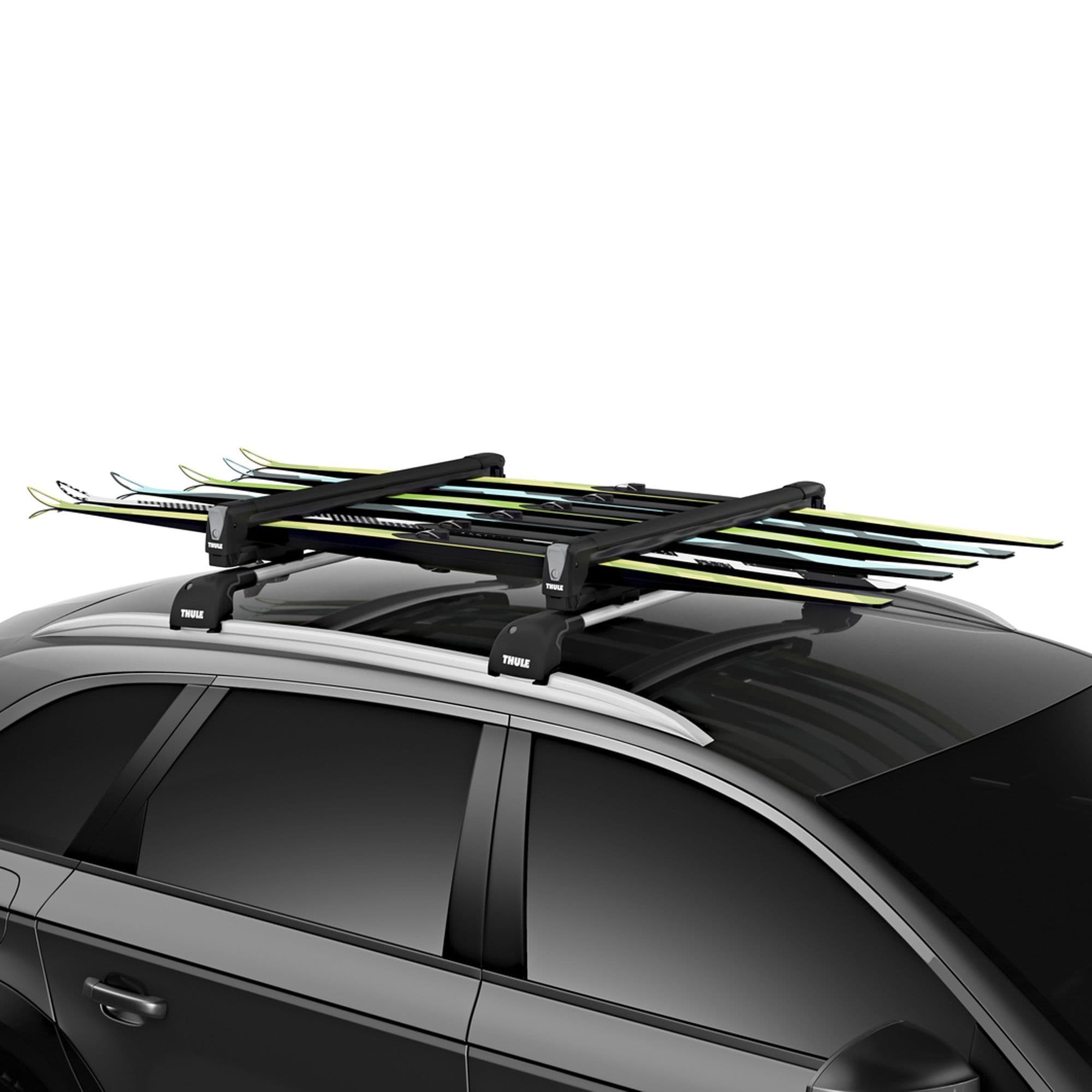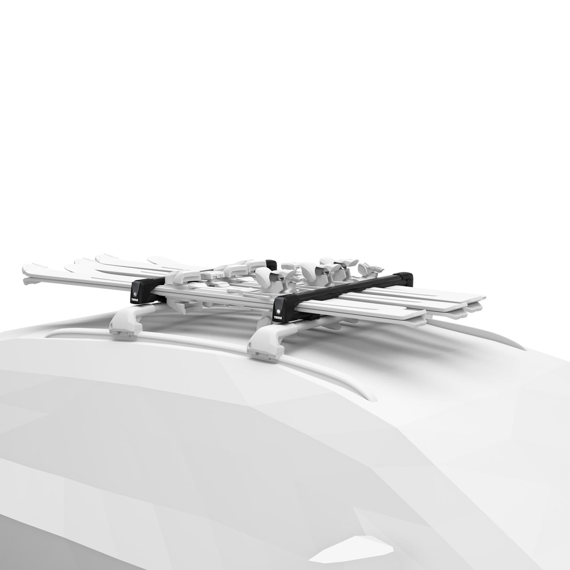 Designed to fit most roof racks, the SnowPack L holds up to 6 pairs of skis or 4 snowboards and features soft rubber arms that firmly grip your equipment without scratching delicate surfaces. The vertical spring system automatically adjusts to varying gear thicknesses, keeping everything stable and secure during transport.