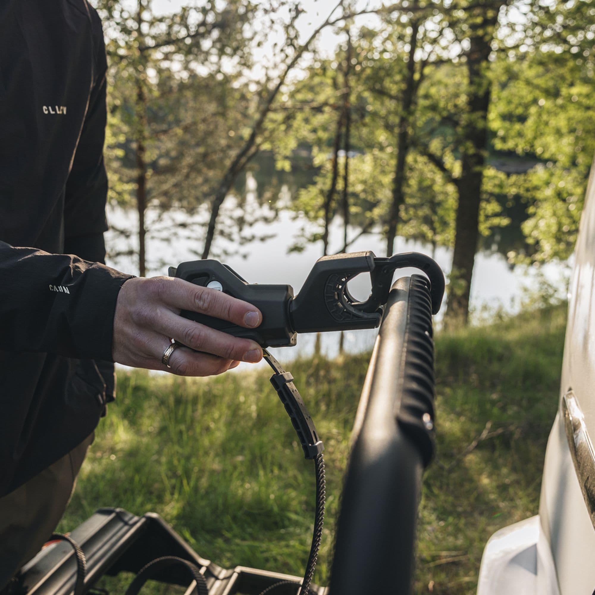 Loading bikes is fast and frustration-free thanks to one-hand-operated detachable bike arms with soft straps that protect delicate frames, including carbon frames. The 19 cm spacing between bikes reduces the risk of contact during transit, ensuring your bikes stay safe even on longer journeys. The rack mounts securely to the towbar using a stable coupling system, allowing easy adjustment before locking it firmly in place.